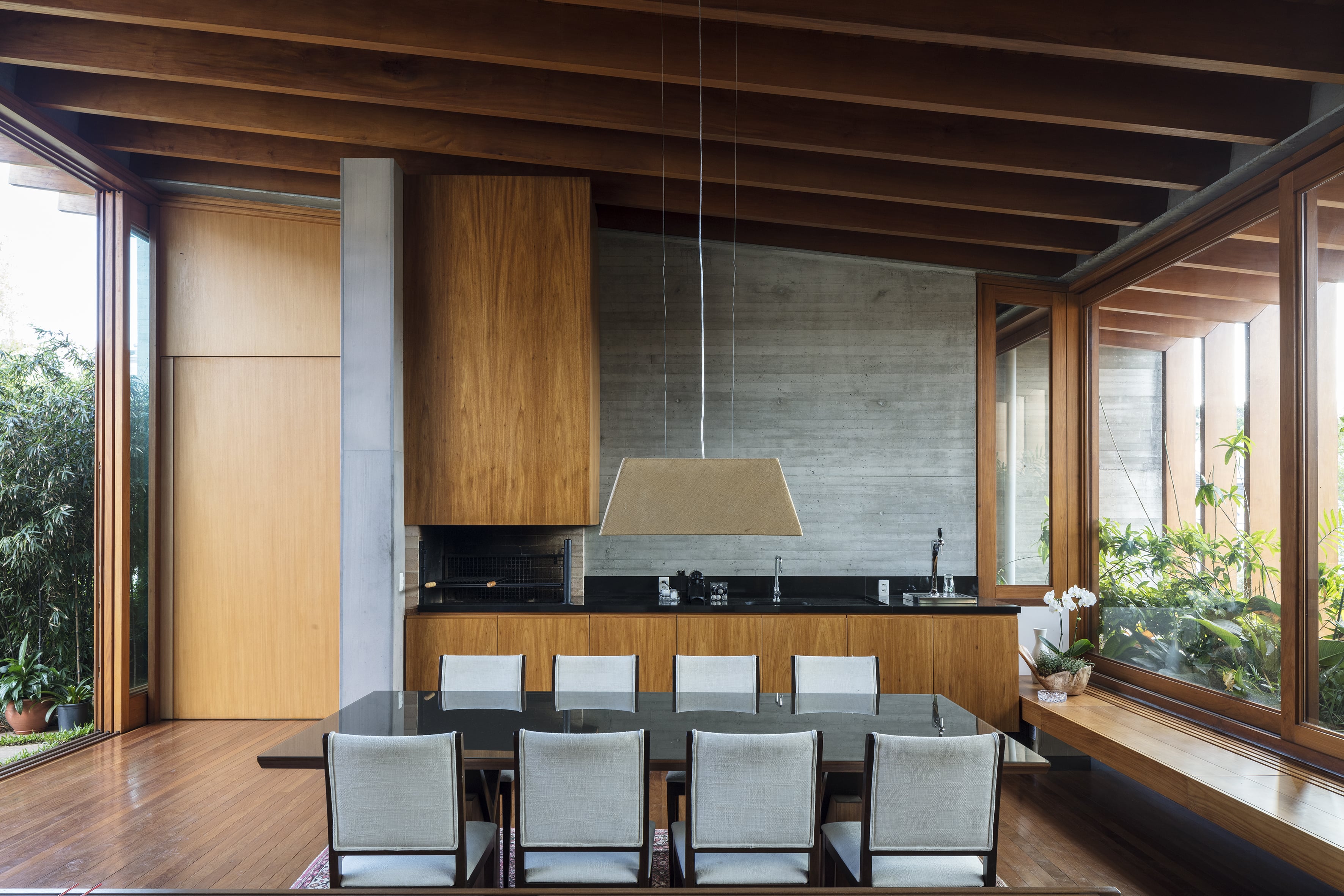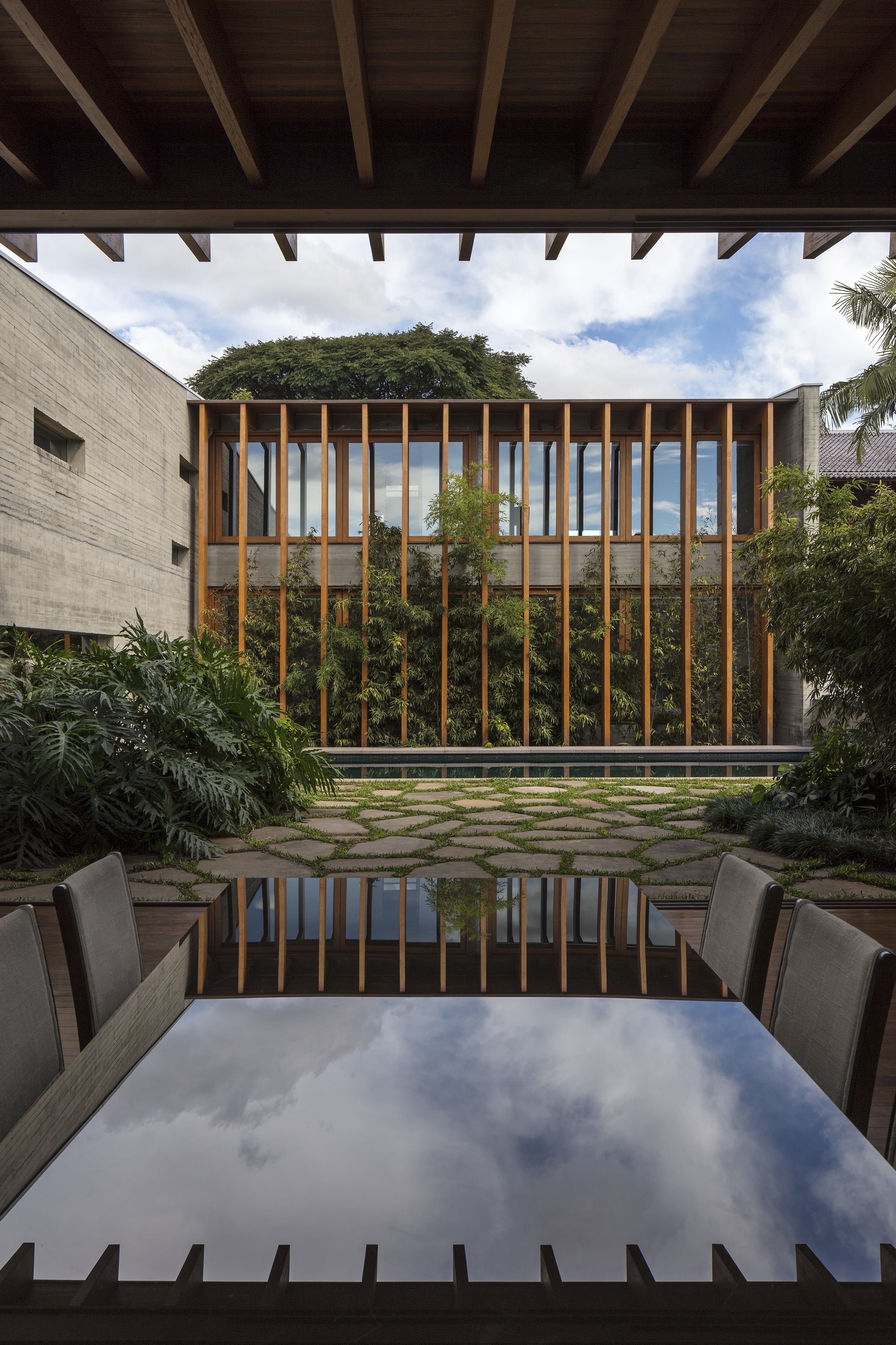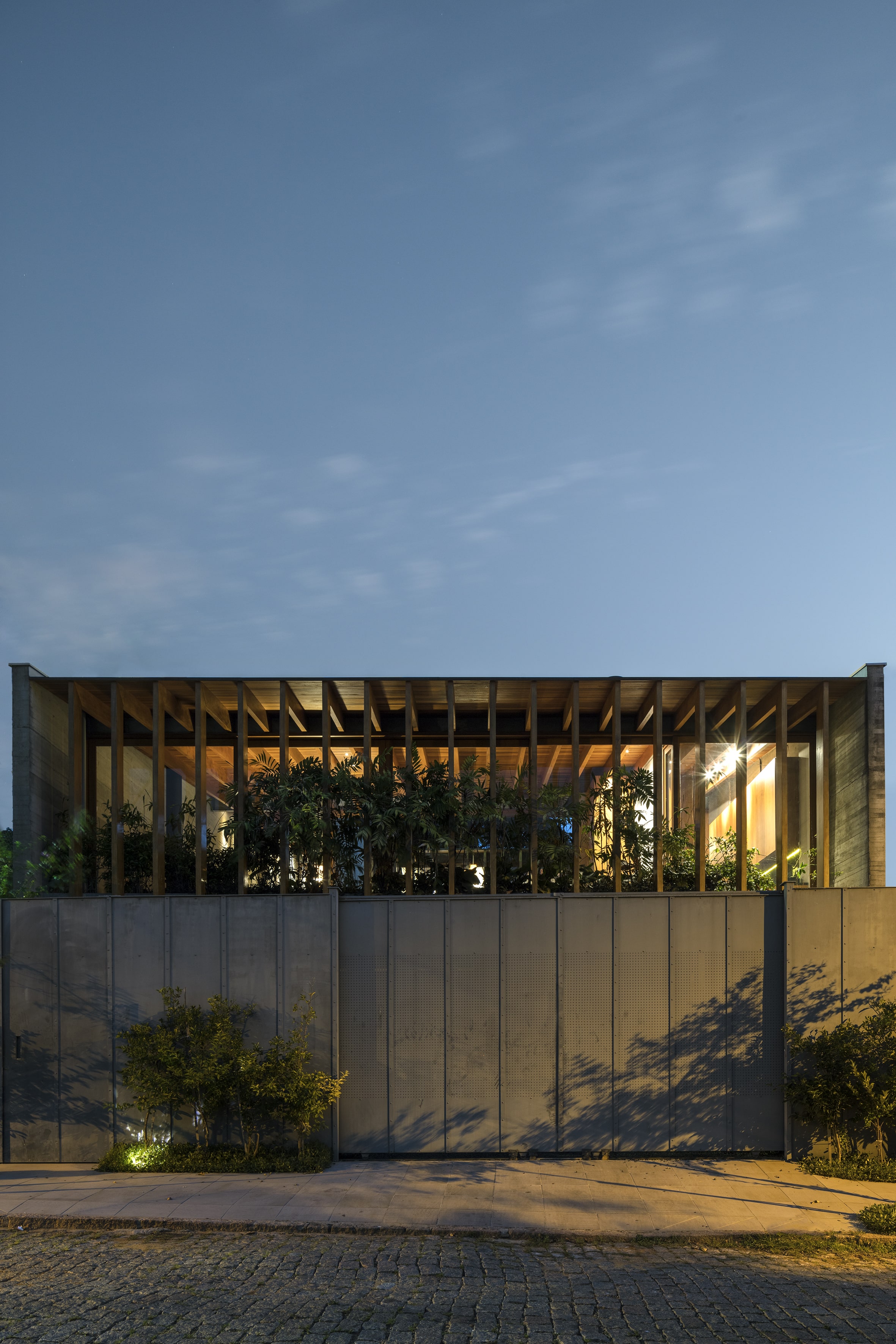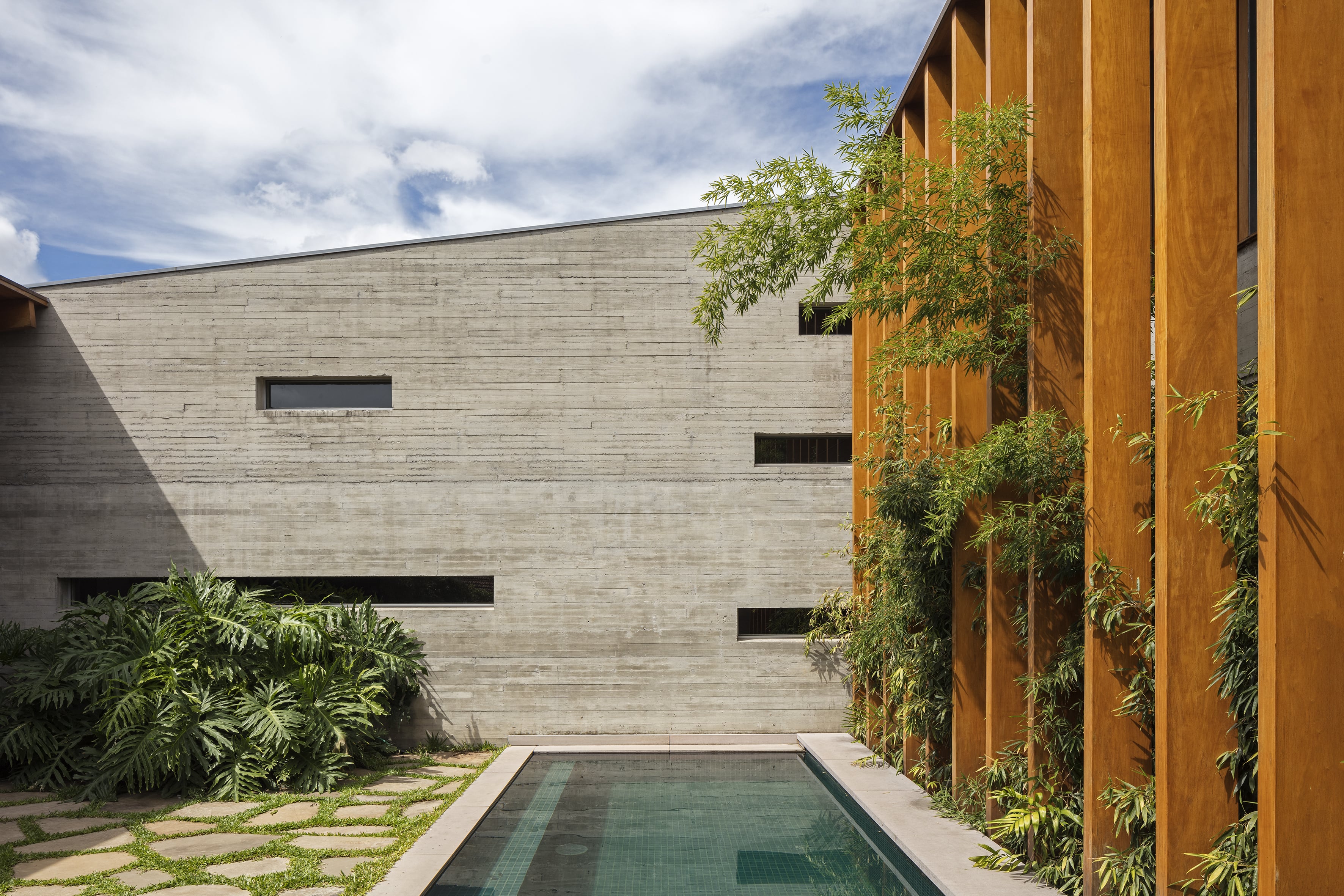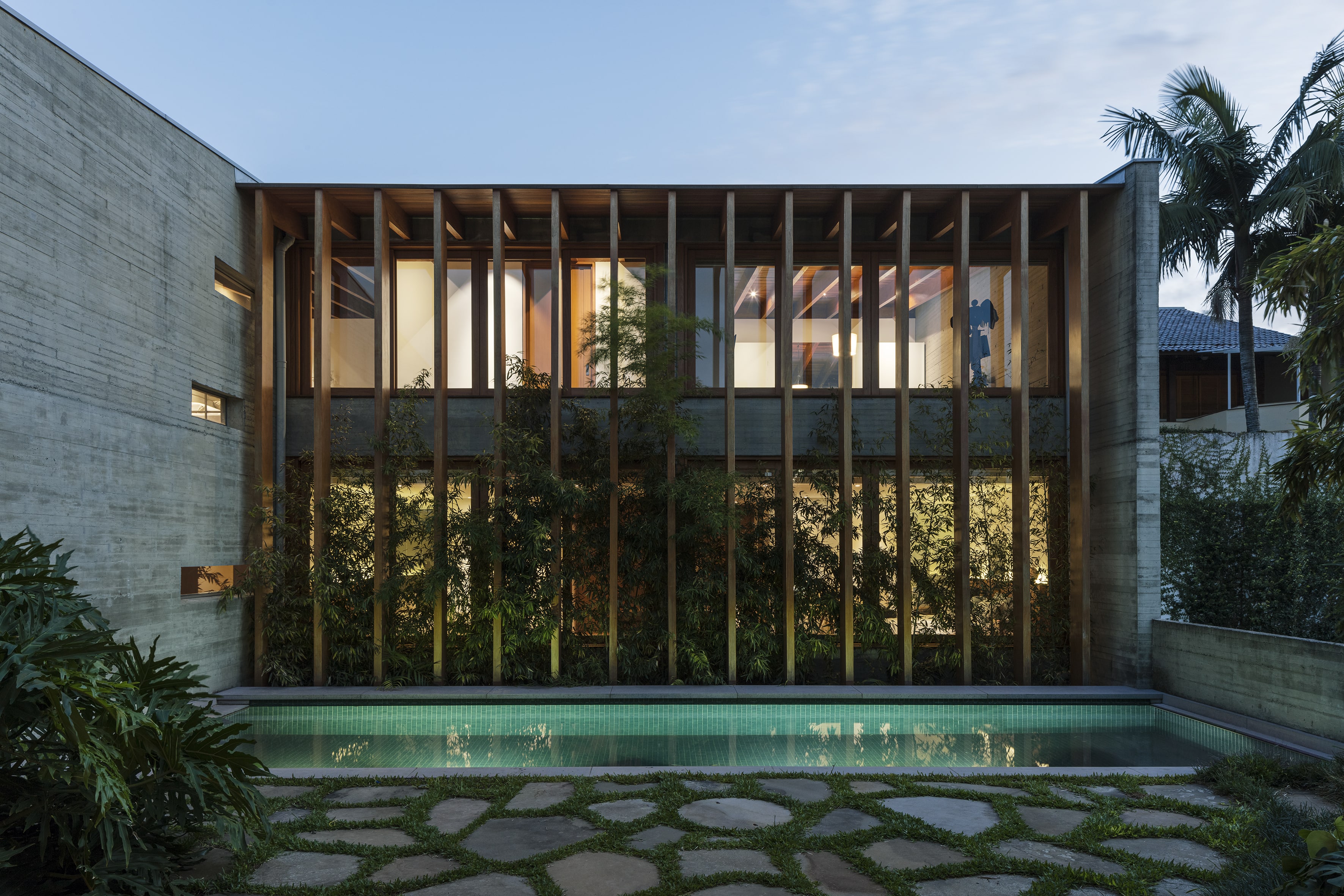Residência unifamiliar de 660 m² distribuída em três níveis escalonados que acompanham a topografia do terreno. O projeto da Bernardes Arquitetura integra os pavimentos por uma escada de madeira central, posicionada entre empenas de concreto aparente que ressaltam a materialidade da construção. As fachadas norte são protegidas por brises verticais de madeira, extensão dos caibros da estrutura aparente da cobertura, que, em conjunto com jardineiras e esquadrias de vidro, filtram a insolação e garantem privacidade.