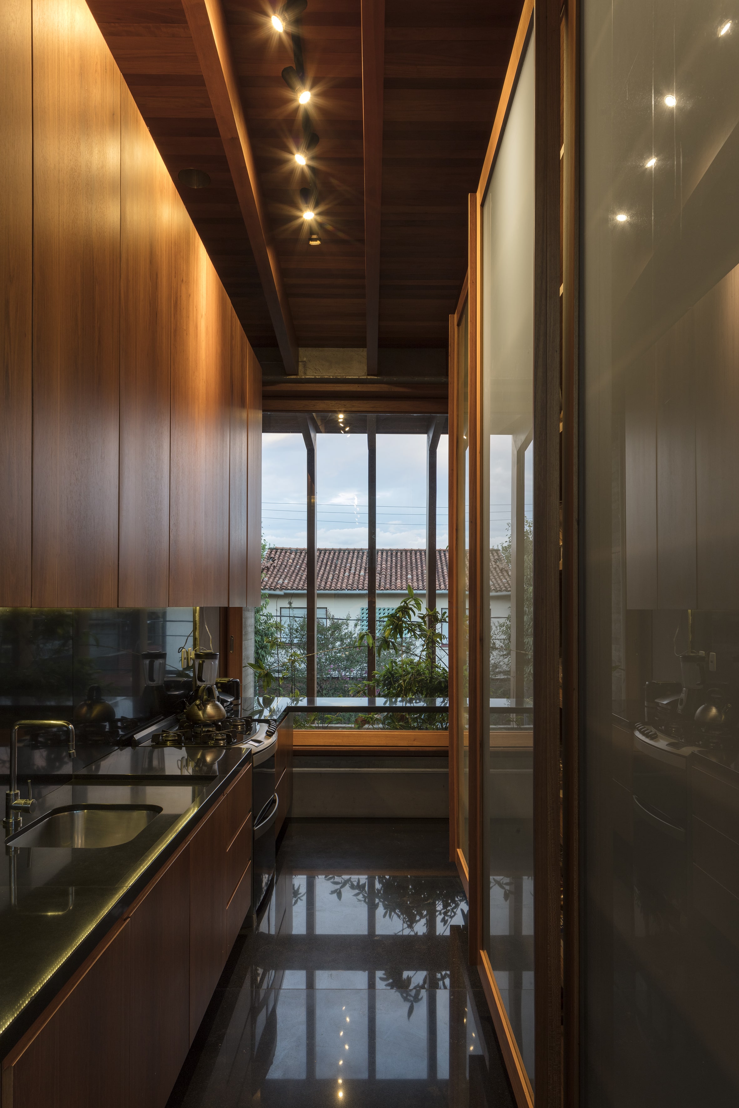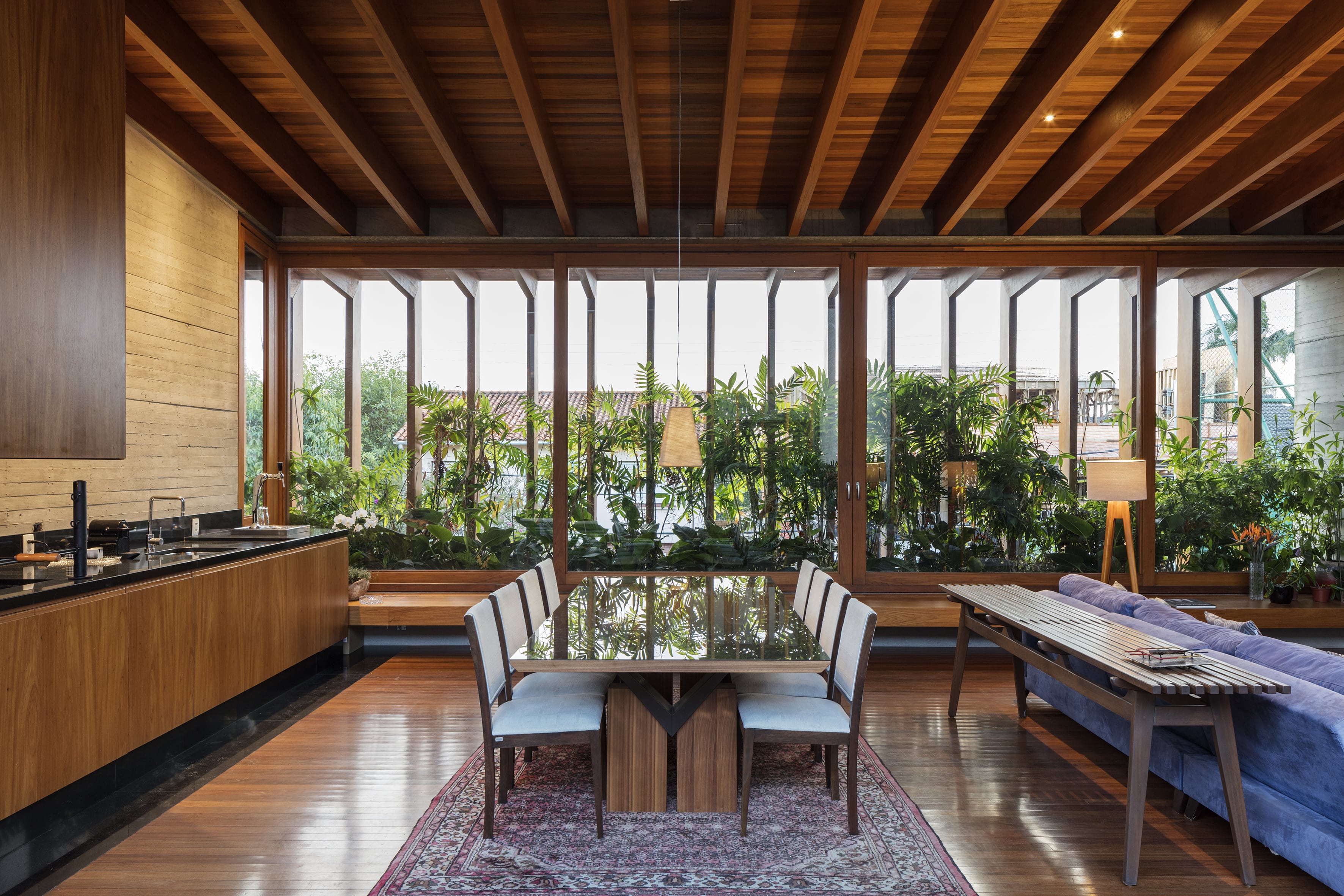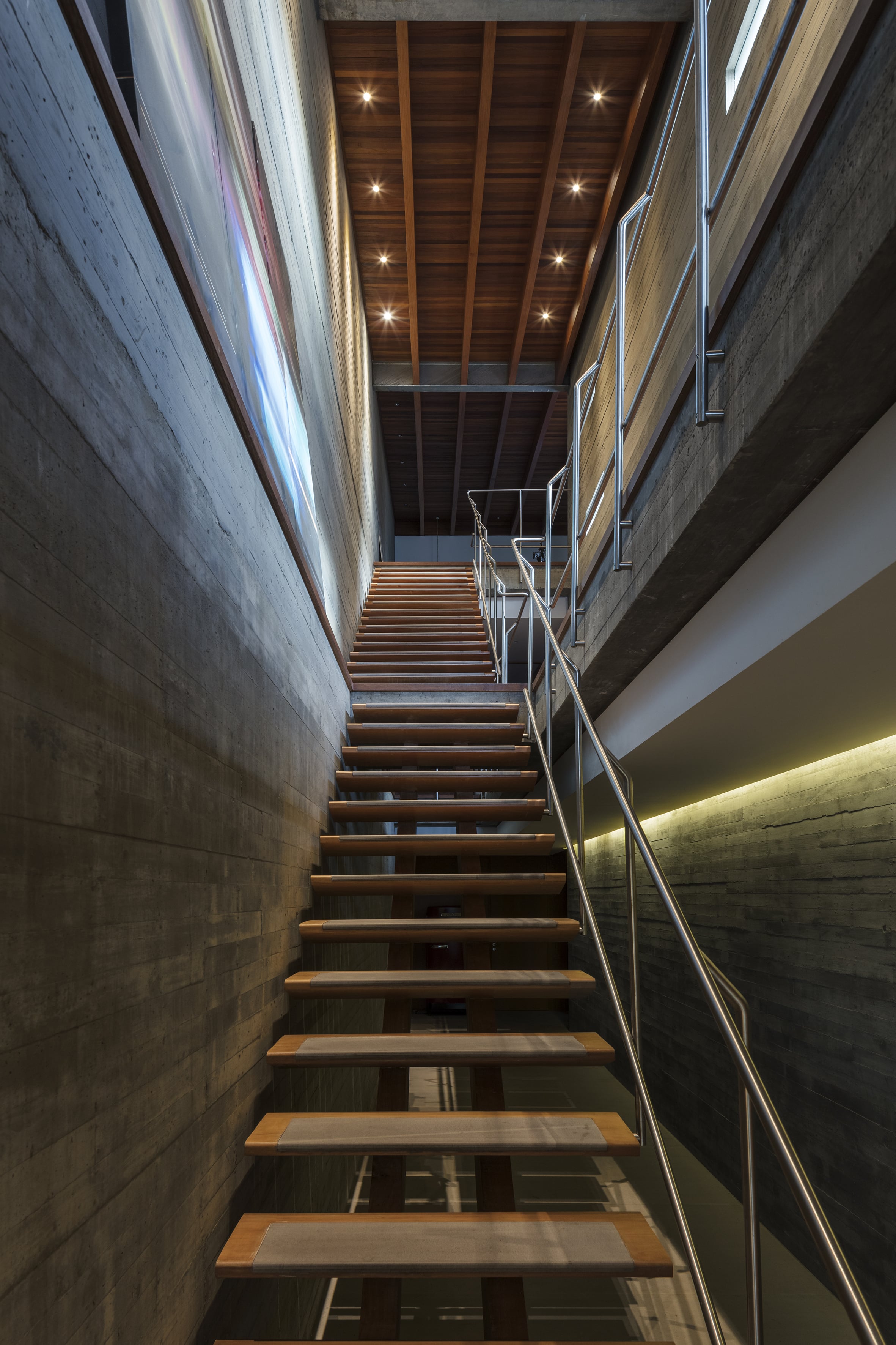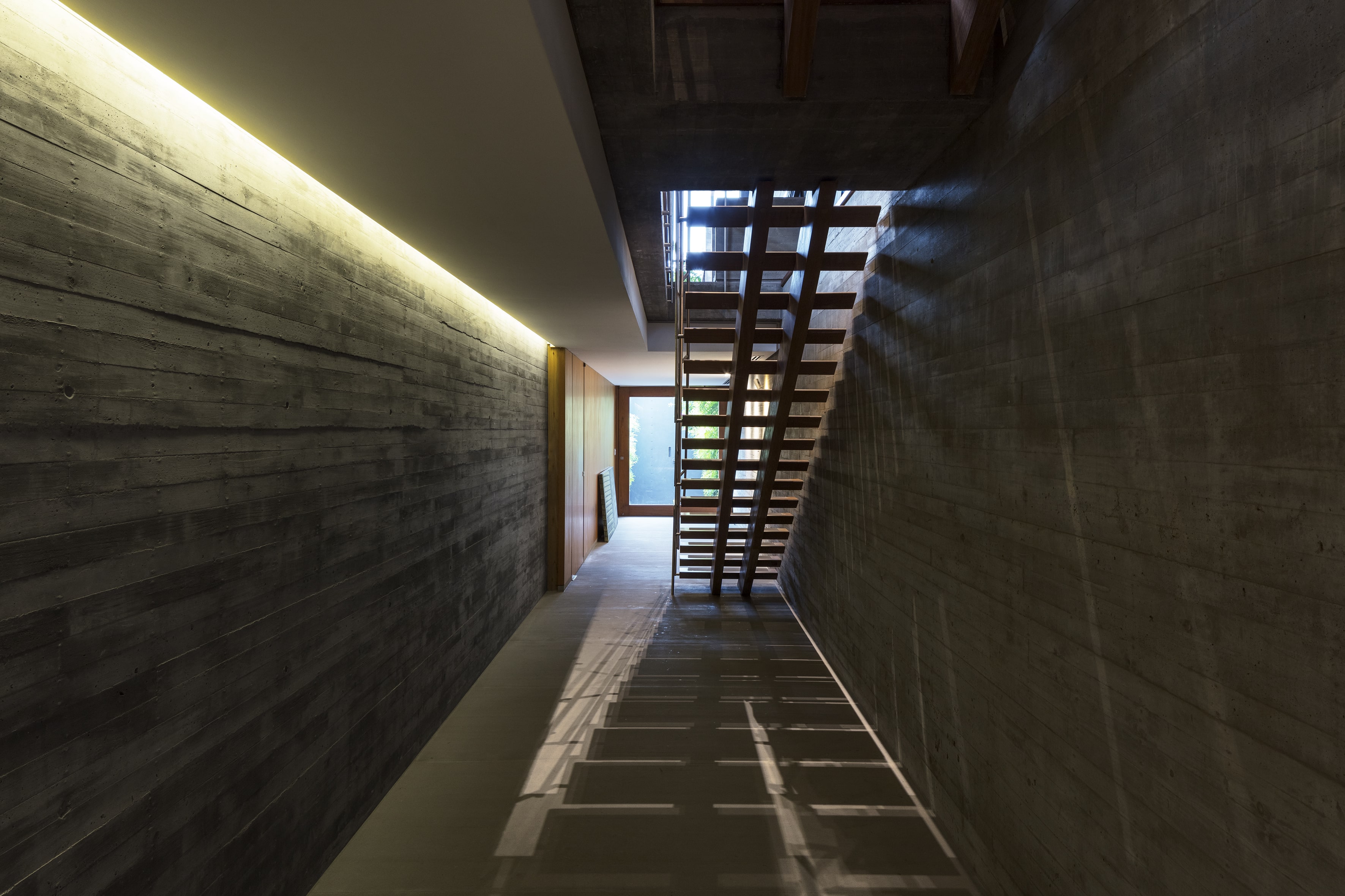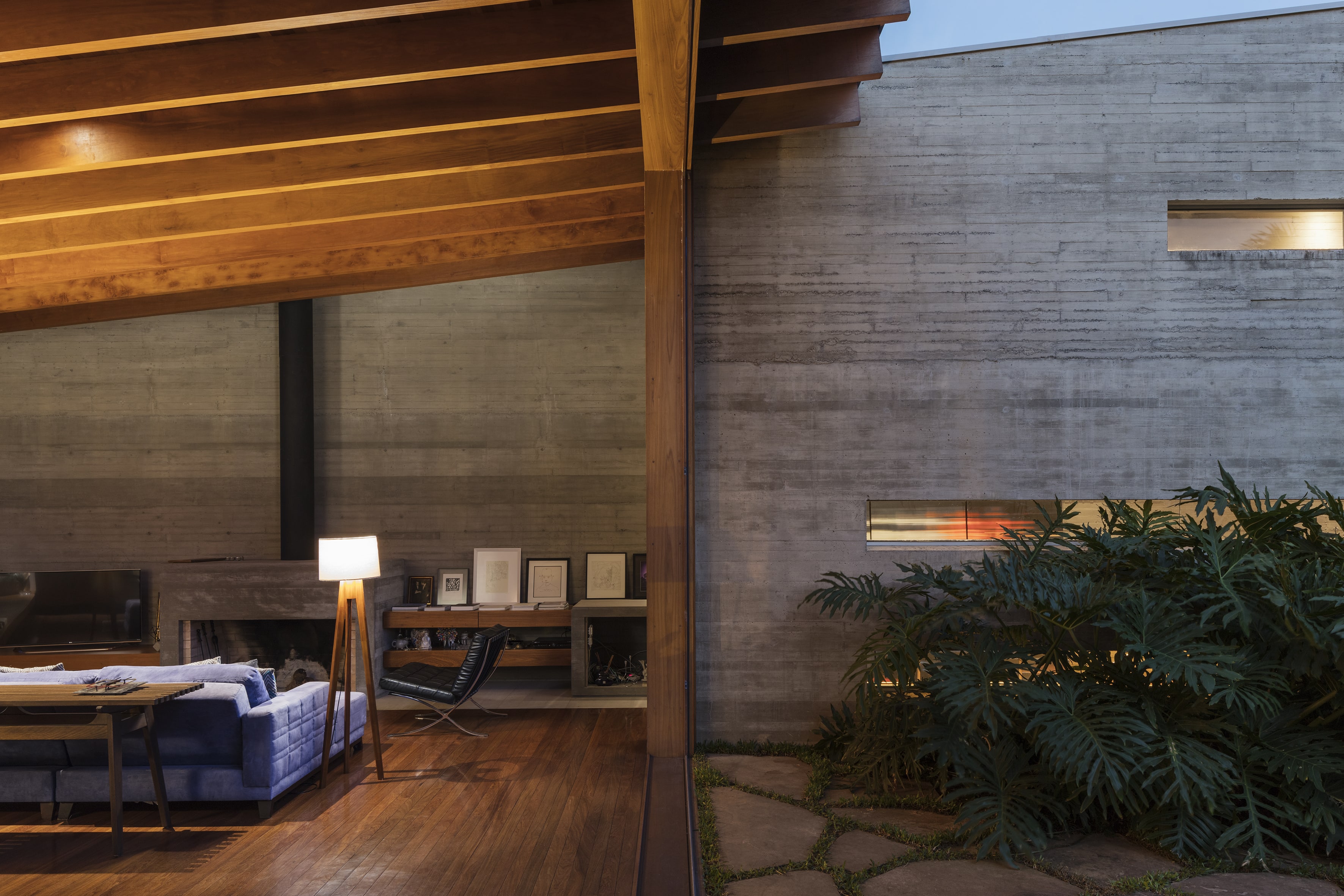Residência unifamiliar de 660 m² distribuída em três níveis escalonados que acompanham a topografia do terreno. O projeto da Bernardes Arquitetura integra os pavimentos por uma escada de madeira central, posicionada entre empenas de concreto aparente que ressaltam a materialidade da construção. As fachadas norte são protegidas por brises verticais de madeira, extensão dos caibros da estrutura aparente da cobertura, que, em conjunto com jardineiras e esquadrias de vidro, filtram a insolação e garantem privacidade.