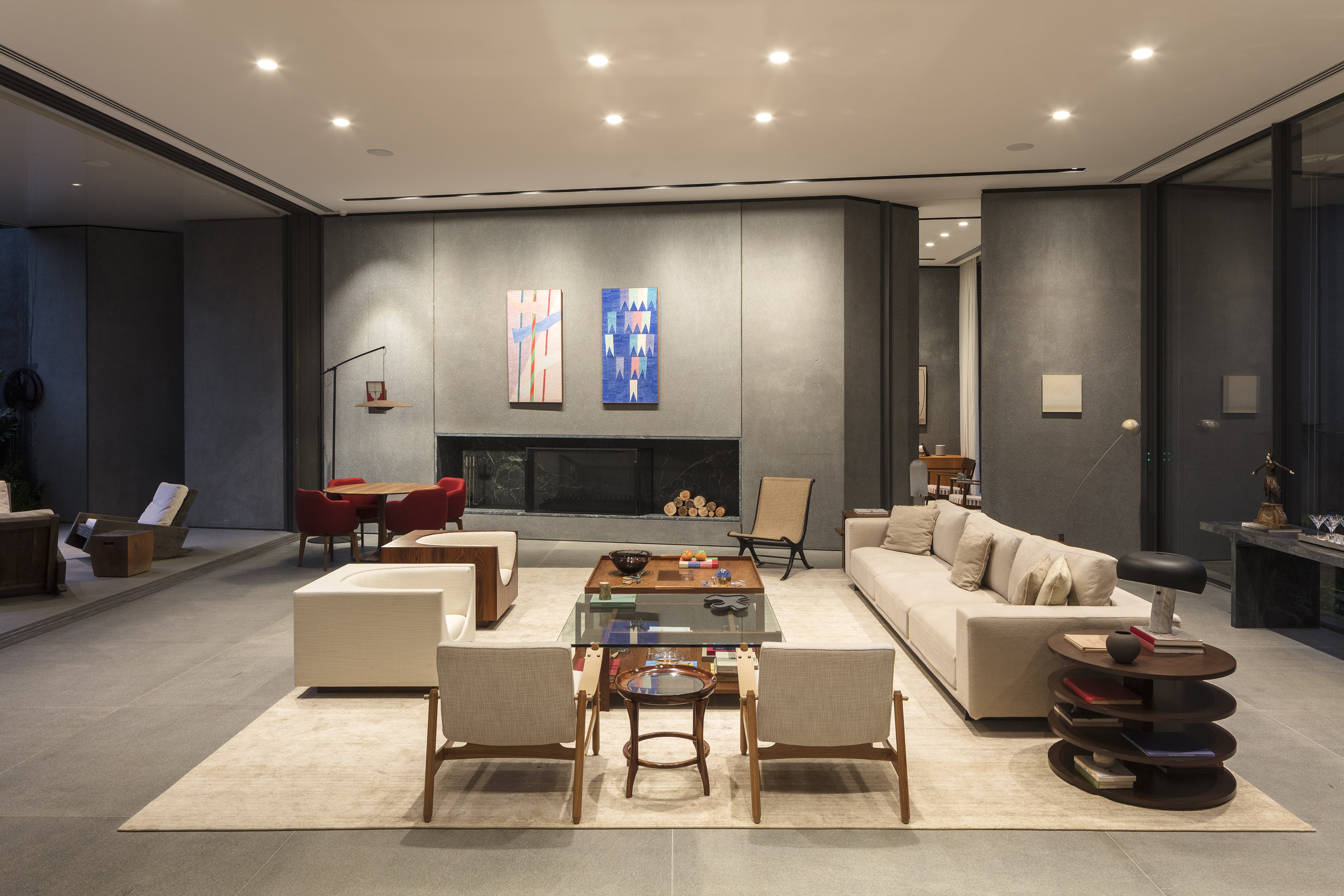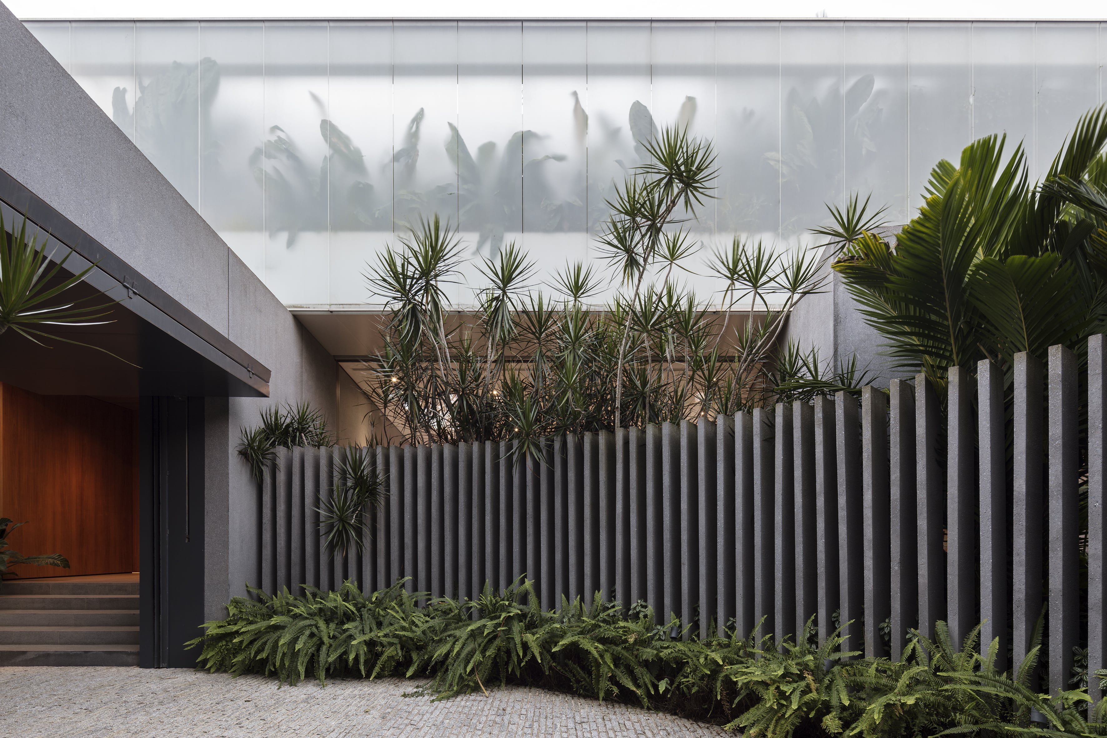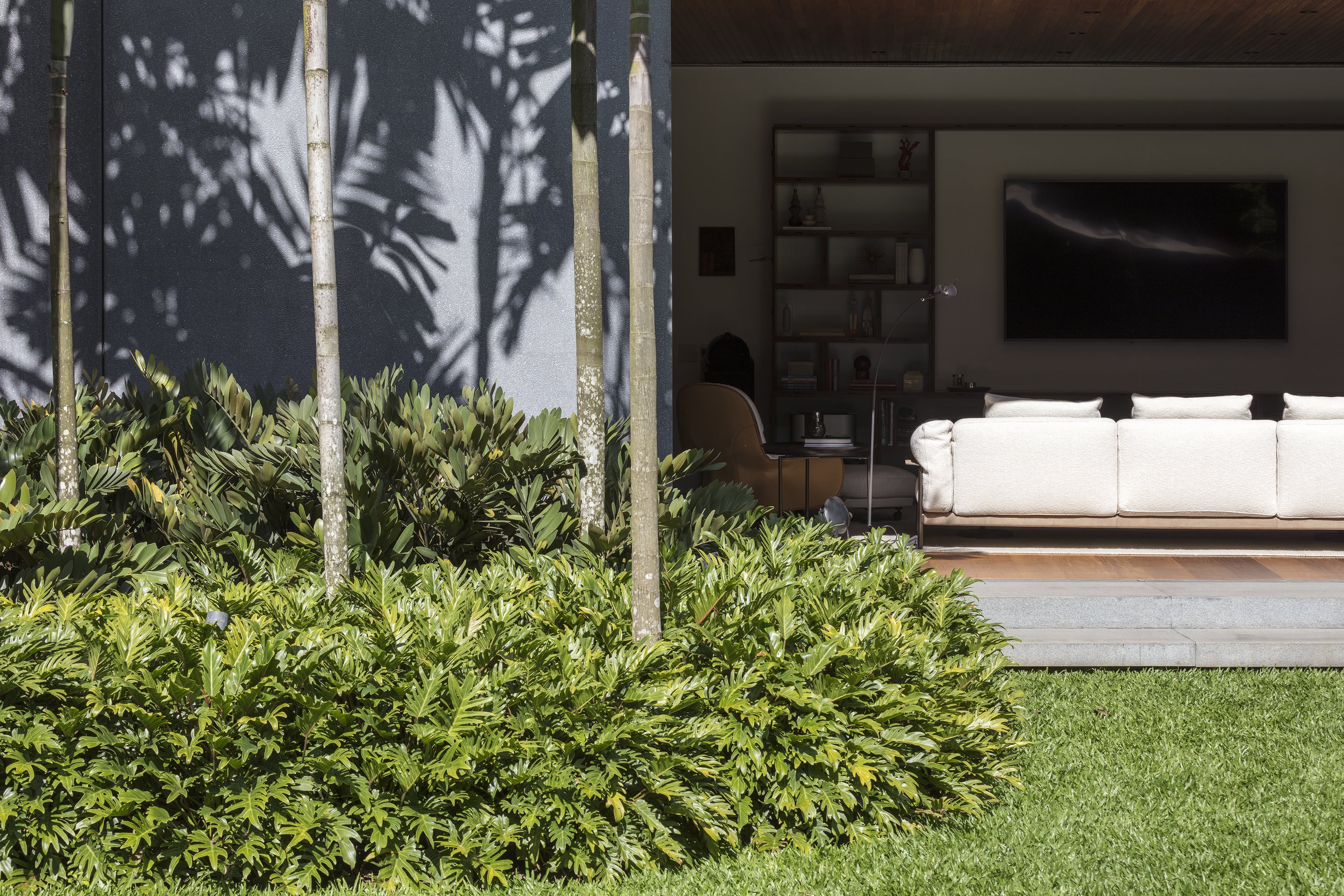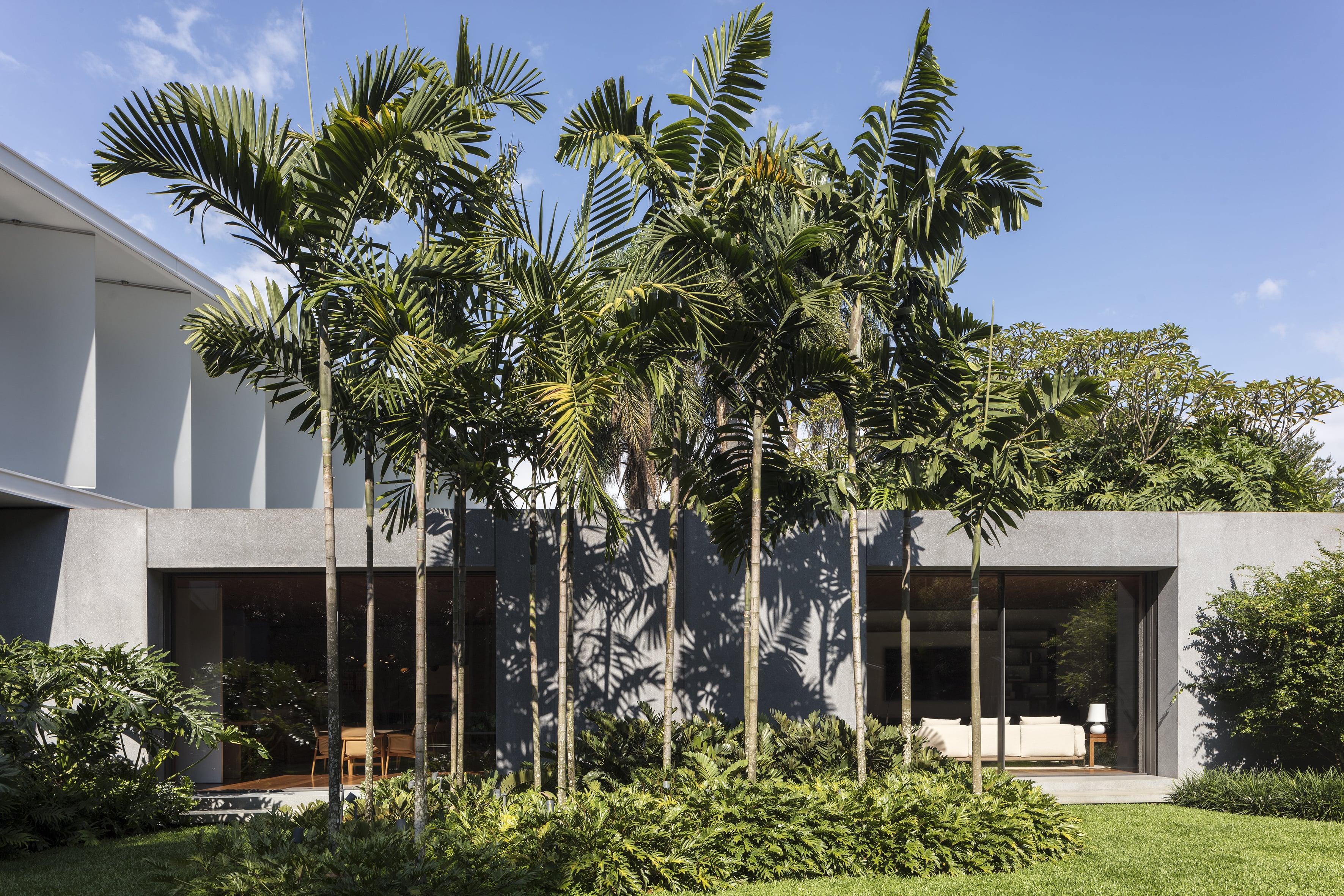 Residência familiar de alto padrão com implantação em “L”, organizada em torno de um pátio central que integra os ambientes internos ao jardim. O projeto da Bernardes Arquitetura é marcado por volumes trapezoidais sobrepostos, estrutura mista e amplas aberturas que favorecem a ventilação cruzada e a entrada de luz natural. No térreo, ficam as áreas sociais e de serviço; no pavimento superior, as suítes e espaços íntimos. Entre os destaques estão a pérgola em madeira laminada colada, o painel artístico em pedra natural e o mobiliário assinado por grandes nomes do design brasileiro.