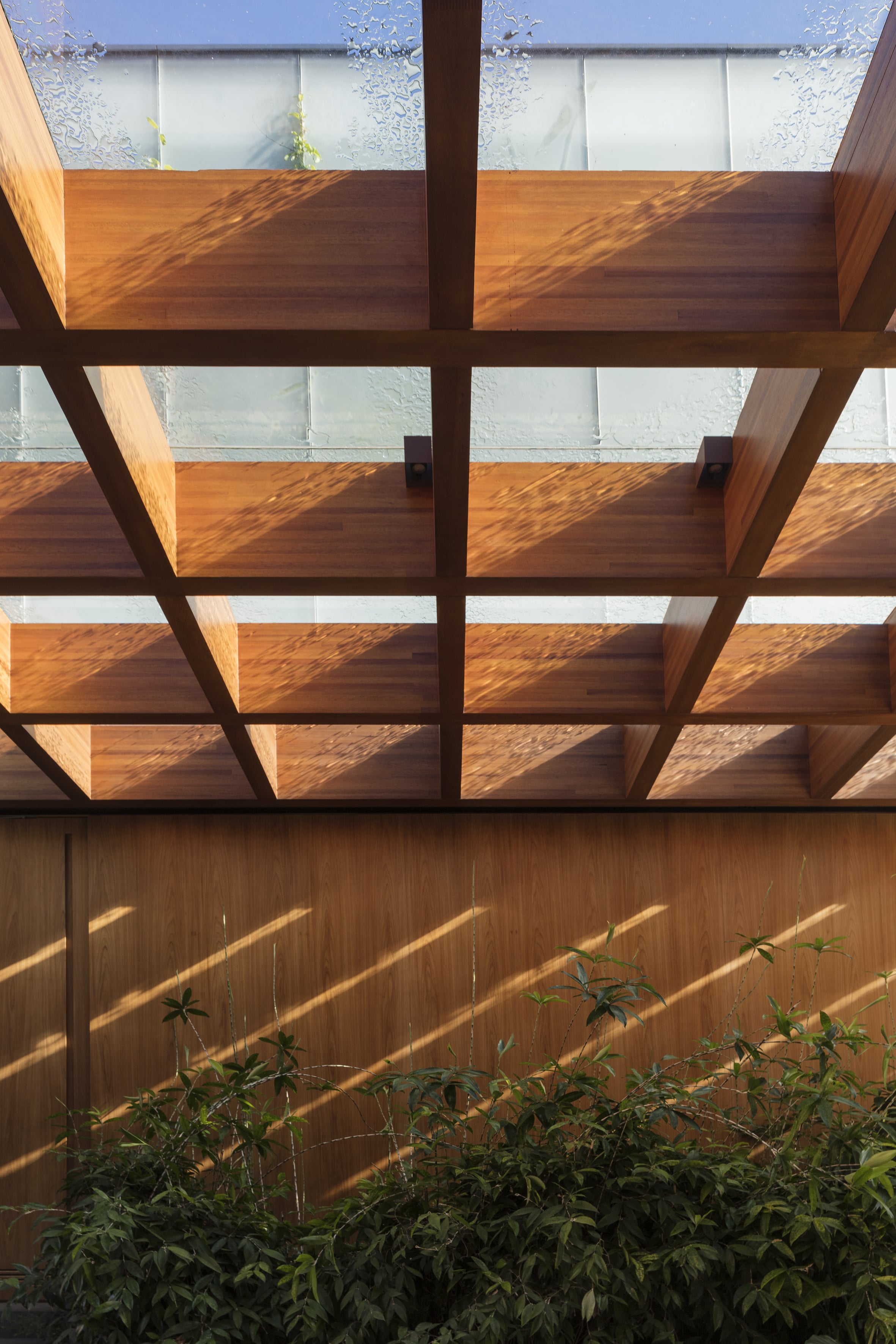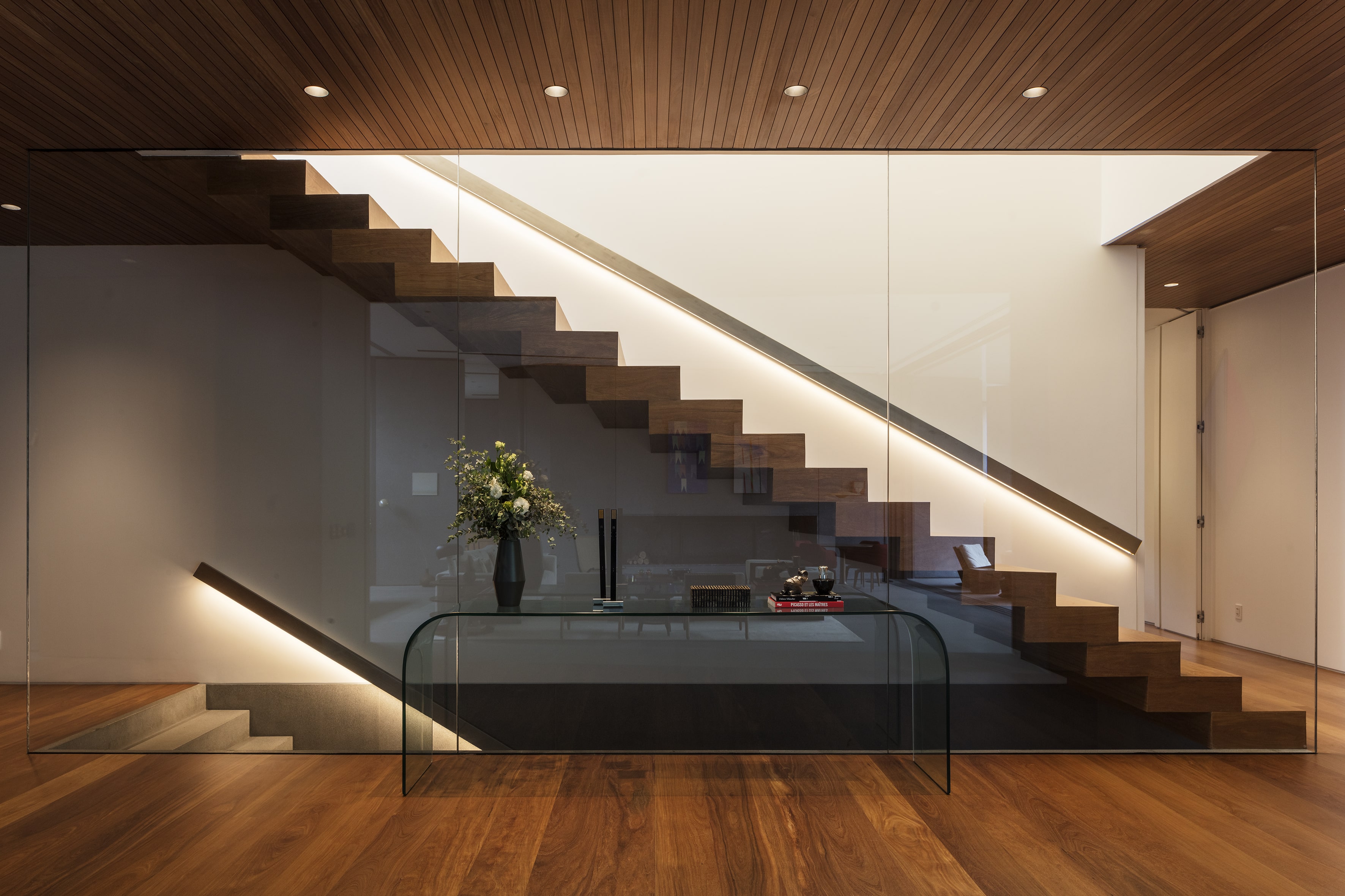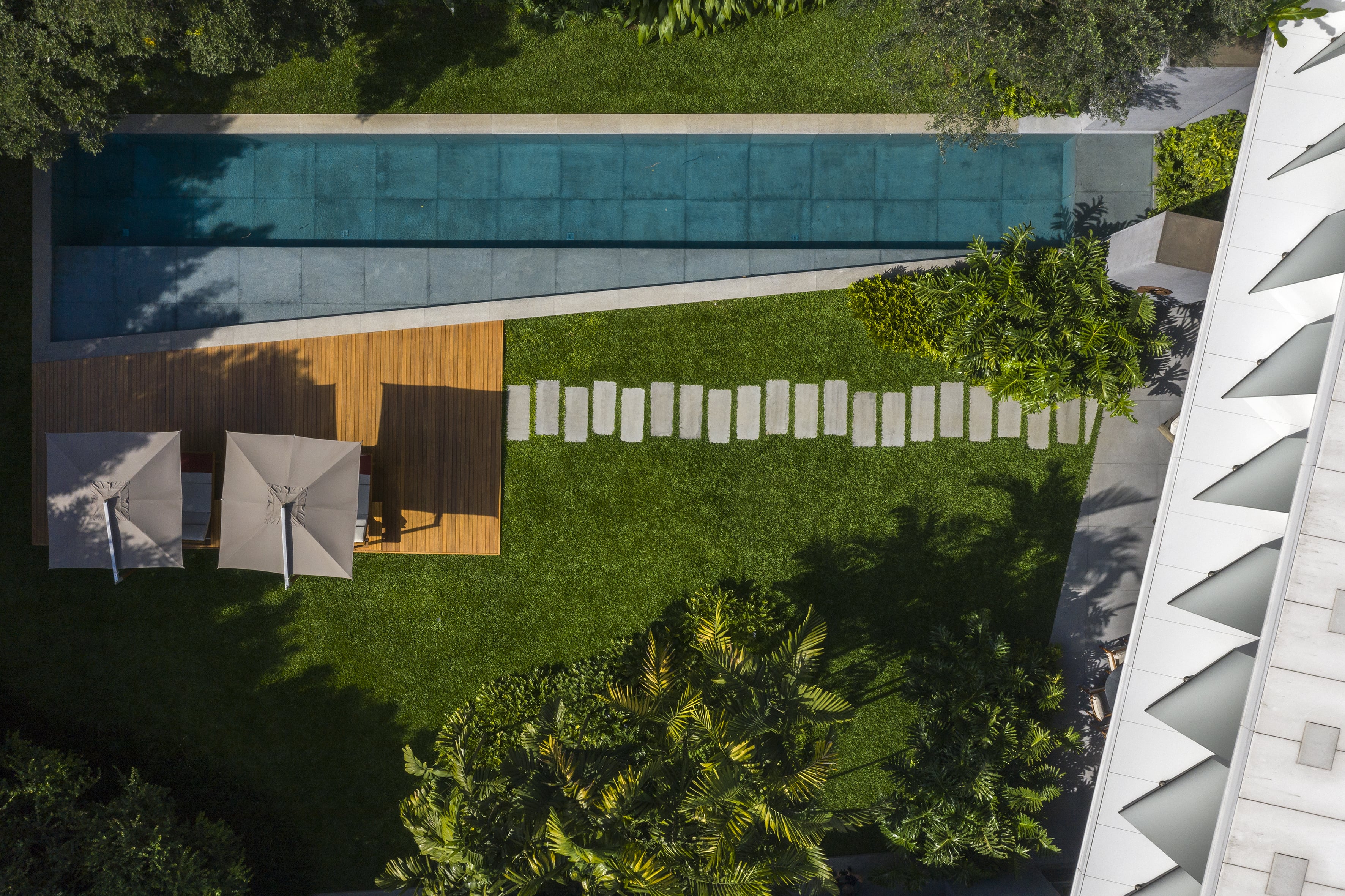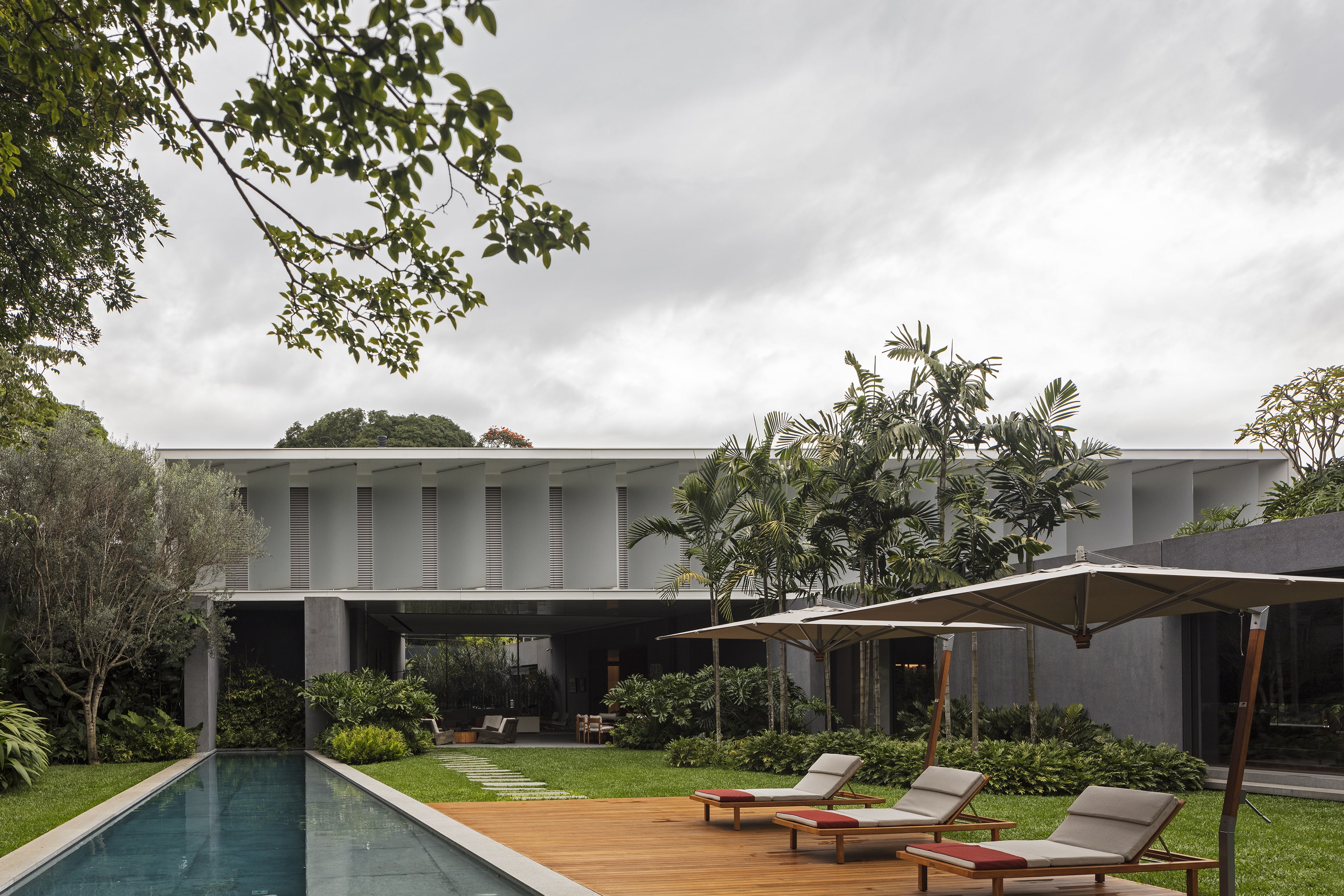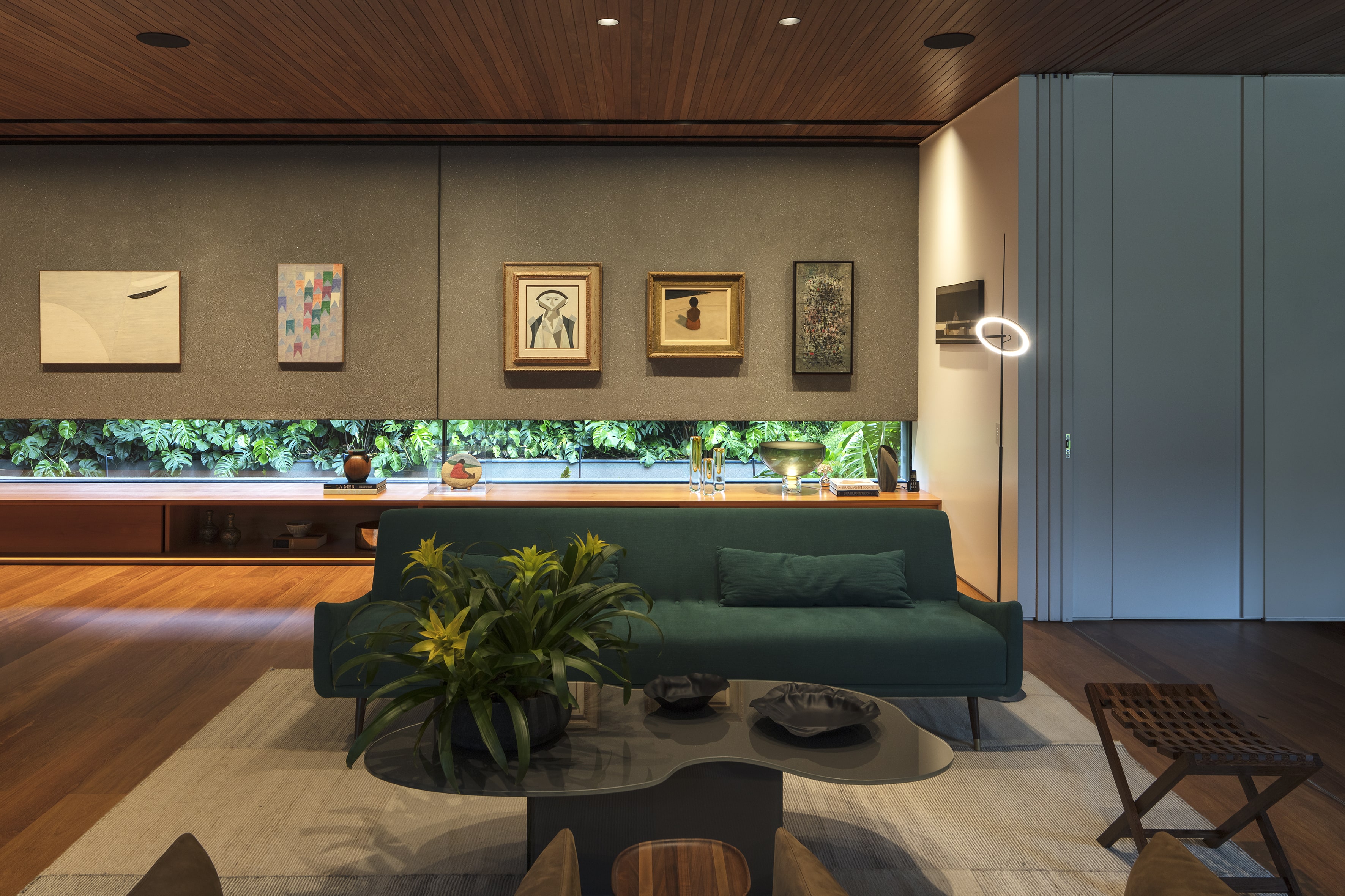 Residência familiar de alto padrão com implantação em “L”, organizada em torno de um pátio central que integra os ambientes internos ao jardim. O projeto da Bernardes Arquitetura é marcado por volumes trapezoidais sobrepostos, estrutura mista e amplas aberturas que favorecem a ventilação cruzada e a entrada de luz natural. No térreo, ficam as áreas sociais e de serviço; no pavimento superior, as suítes e espaços íntimos. Entre os destaques estão a pérgola em madeira laminada colada, o painel artístico em pedra natural e o mobiliário assinado por grandes nomes do design brasileiro.